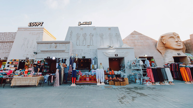 ومنذ الخطوة الأولى في الجناح المصري، تلفت أنظار الزائر المجسّمات الفرعونية الكبيرة لأهرامات الجيزة، إحدى عجائب الدنيا السبع، ومجسم أبوالهول، والنقوش الفرعونية التي تزين واجهات محال الجناح، ليبدأ الزائر رحلته وسط مجموعة متنوعة من المعروضات، من بينها تحف صنعت يدوياً بمهارة محترفي الحفر على النحاس والأطباق، والتحف والأنتيكات المصرية الشهيرة المصنعة يدوياً، التي تعرض في حي خان الخليلي بقلب العاصمة القاهرة، مثل الأرابيسك والزجاج المعشق وغيرهما. ويبرز الجناح بعض الشخصيات المصرية الفنية الشهيرة، مثل كوكب الشرق أم كلثوم وموسيقار الأجيال محمد عبدالوهاب والعندليب عبدالحليم حافظ، وغيرهم، عبر صورهم المطبوعة على تحف فنية ومجسمات آلات موسيقية والأكواب والصواني وأطباق الديكورات، كما يعرض الجناح مجموعة من الآلات الموسيقية والإيقاعية التي تستهوي الكثير من الزوار.