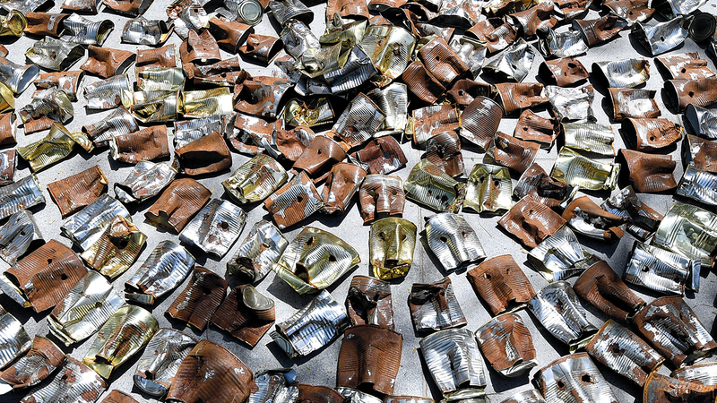 الفنان حسين شريف، الذي تقدم أعماله للمرة الأولى في معرض فني كبير بالإمارات، من خلال غاليري سلوى زيدان، يُعرض له في الحديقة الخارجية عمل بعنوان «وجوه»، يتكون من علب حديد. ويعمل حسين شريف على صياغة العمل، انطلاقاً من مفهوم الاستهلاك والتكرار وإعادة صياغة الأشكال للمواد المحيطة بنا والتي ترتبط بحياتنا اليومية. ولا يختلف أسلوب حسين شريف عن أسلوب أخيه الراحل حسن شريف، فنان المواد المهملة والأشياء الصغيرة، حيث نرى في هذا العمل النمط التعبيري التركيبي نفسه، إذ يعمل حسين على إعادة تشكيل العلب الحديدية التي نصادفها في حياتنا اليومية، من خلال استخدامنا للمعلبات الغذائية، ثم يمنح هذه العلب التي تآكلت بفعل الصدأ بعداً جديداً، ويثقبها لتبدو وجوهاً بشرية لها عيون وأفواه، وينثرها على الأرض بشكل عفوي قابل لاحتمالات لا متناهية.
