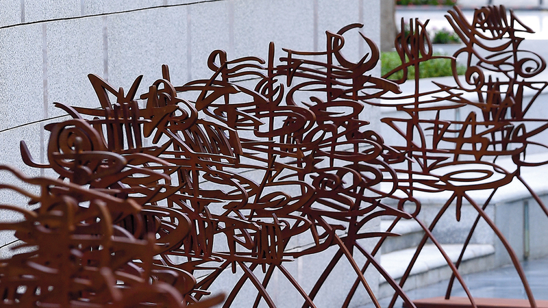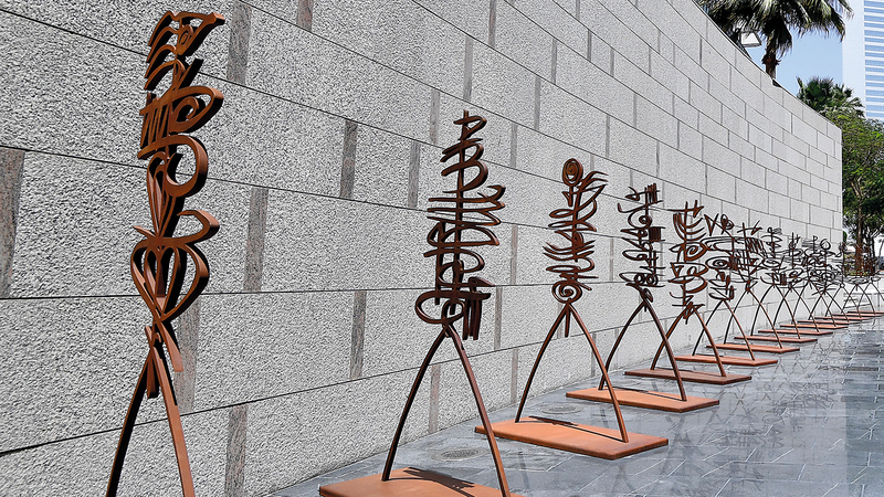 مجموعة من المنحوتات المميزة تستقطب زوار النسخة 14 من «آرت دبي» في الحديقة الخارجية لمركز دبي المالي، والتي تفصل القاعات عن بعضها بعضاً، وتتنوع في المواد المستخدمة وفي الرؤية الفنية التي تحملها. ثمانية أعمال تطوع المواد الصلبة في معظمها، كونها تعتمد على الحديد والمعادن بشكل أساسي، وتقدم للحضور فرصة استكشاف الفن الثلاثي الأبعاد من ثقافات متعددة، فهي تتأرجح بين التي تعتمد على الحضارات القديمة والفن العربي، لتصل إلى الأشكال التجريدية أو حتى الإفريقية، فيبدو المعدن كما لو أنه الراوي الفعلي للثقافات. وعلى الرغم من تباين الأشكال الفنية وألوان المواد المستخدمة، فإنها جميعاً تنصهر مع الباحة الخارجية وتتآلف مع المكان، وما يحمله من طبيعة وعمارة قائمة على الأبراج.