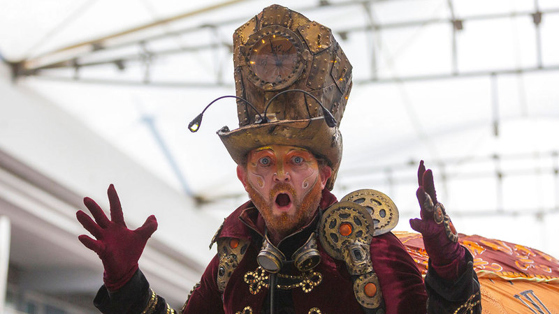 تتحوّل قاعات وردهات معرض الشارقة الدولي للكتاب إلى فضاء مفتوح للعروض الفنية تجمع الجمهور من الكبار والصغار، يقدمها فنانو أداء، وعارضون من مختلف بلدان العالم، يطلون بأزيائهم المدهشة ويقودون الجمهور إلى عوالم من الخيال، تتحرك فيها ساعات، وتحلق فيها المناطيد، حيث تتجول كل يوم شخصيات «ستيم بانك» بقاماتها العالية، والزخارف التي تزين وجوهها، فتستوقف الزوار ليلتقطوا معها صوراً، ويكملوا جولاتهم على الكتب والورش.