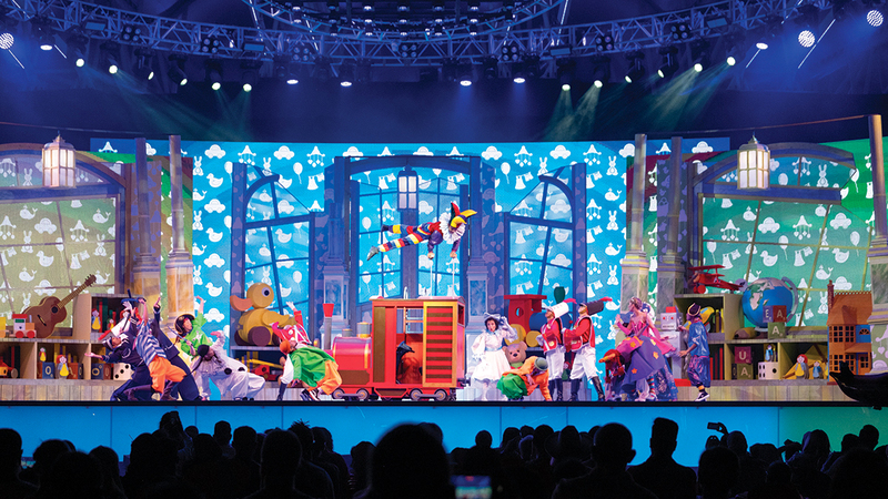 وتم تعزيز المسرح الرئيس بأحدث المؤثرات البصرية والسمعية لتقديم تجربة ترفيهية للعروض التي تم إنتاجها حديثاً بدعم من فريق إدارة الترفيه في القرية العالمية مثل عرض «هير كامز ذا بووم!» الذي يقدمه فريق «آربان كرو»، وعرض «خفايا الظلام»، و«سلام»، و«سكاتي تشاباتي» و«مهرجون النجدة» و«أبسولوت بوليوود: الجزء 2».