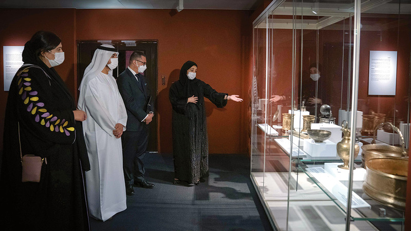 عبدالله بن سالم القاسمي خلال افتتاحه المعرض في متحف الشارقة للحضارة الإسلامية. من المصدر