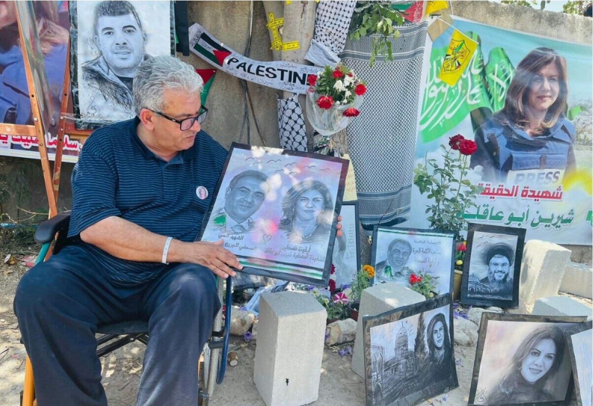 وبينما تتجول السمار بين لوحاتها الفنية برفقة الزوار، يجلس الصحافي الفلسطيني علي السمودي الذي أصيب برفقة أبو عاقلة، على كرسي متحرك، يحمل صورا لشيرين أبو عاقلة خطتها الفنانة التشكيلية عقب اغتياله.