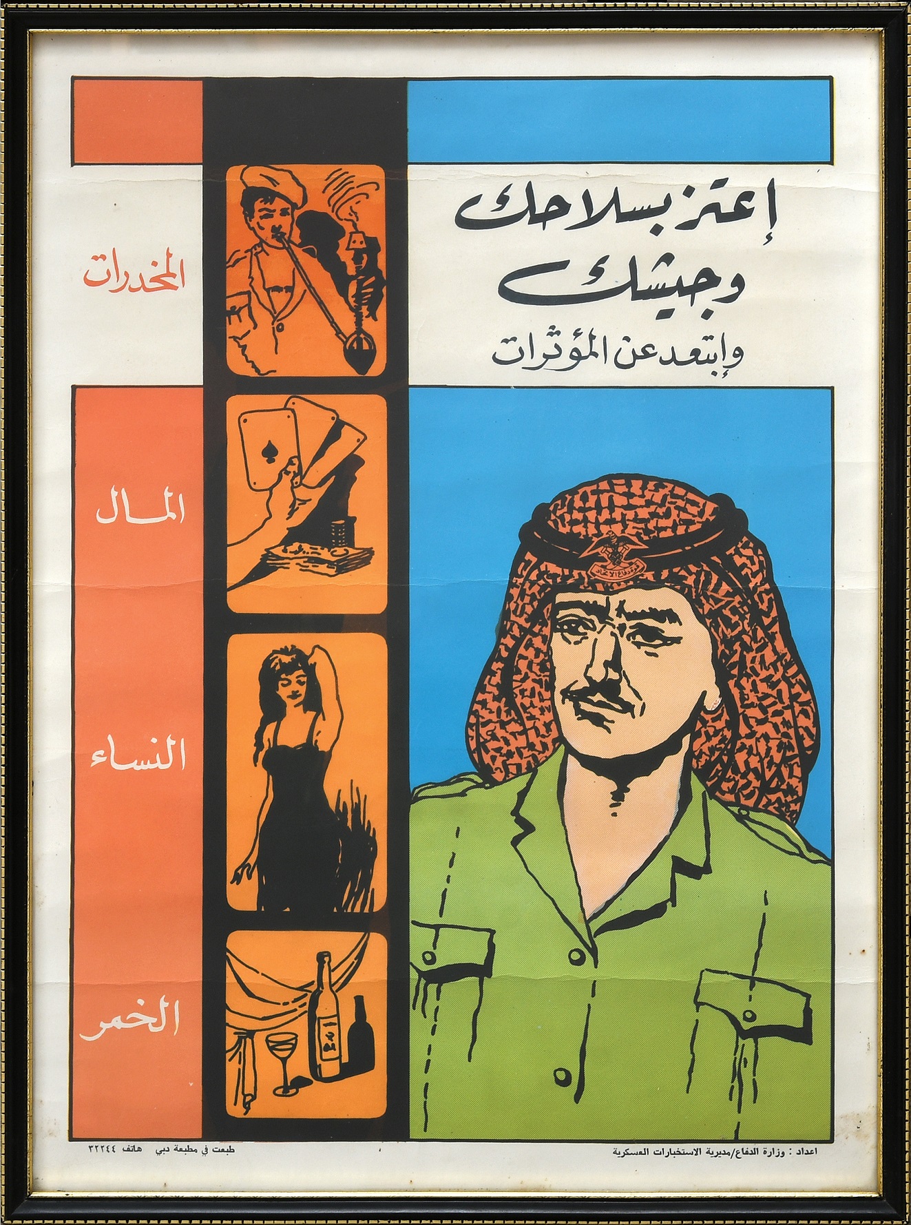 • ملصق حائط تحذيري نادر، ومذهل وبألوان جريئة يعود إلى أوائل السبعينيات من القرن الماضي، وهو موجّه لأفراد قوة دفاع الاتحاد المشكَّلة حديثاً بدولة الإمارات العربية المتحدة، منصوصٌ فيه: "افتخر بأسلحتك وجيشك. ابتعد عن التأثيرات التي تضر بك: المخدرات، والمال، والنساء، والخمر"- تظهر بالملصق صورة مجنّد أنيق يرتدي الكوفية ويحمل شارة UDF، ومُحاط بإغراءات النرجيلة، وورق اللعب، والفتيات الفاتنات، وزجاجات الخمر - 1,875 جنيه إسترليني.