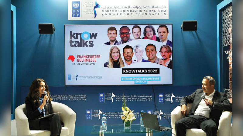 في جناحها المتميز، واصلت مؤسسة محمد بن راشد للمعرفة حواراتها الثرية، التي تنظمها في الدورة الـ73 من معرض فرانكفورت الدولي للكتاب، الذي تقام فعالياته في الفترة بين 19 و23 الجاري، تحت عنوان «الكلمات تربط العالم»، بمشاركة 7500 عارض من 100 دولة حول العالم.