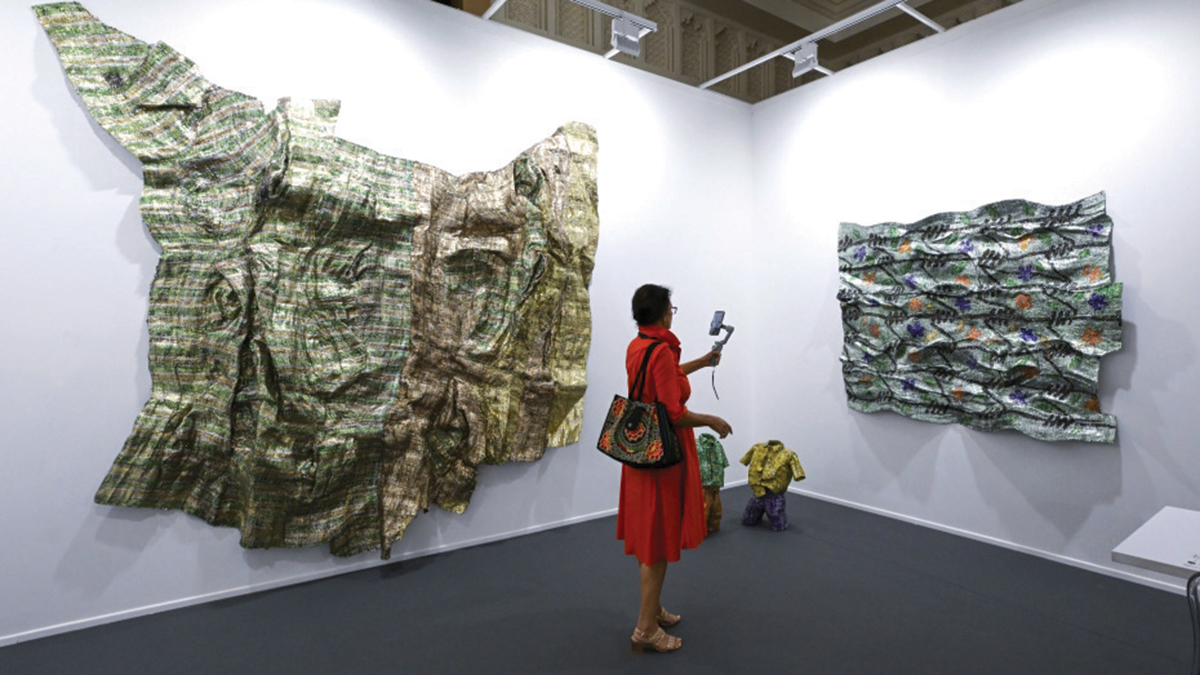 من جهته عرض كوامي مينته مؤسس «إيفيه غاليري» عملاً للفنان إل أناتسوي، يحمل عنوان «باسكيت ماوث»، ويحمل مفهوم الاستدامة، الذي شرحه بالقول: «قام الفنان بصياغة العمل من أغطية قوارير المياه المصنوعة من الألومنيوم، وقام بطيها بشكل يسمح له بصياغة العمل من خلال وصلها بأسلاك من النحاس». وأشار إلى أن العمل استغرق من الفنان شهوراً كي يكتمل، لأن هذه الأعمال تستغرق الوقت في تحويل شكل المادة الأولي، وكذلك جمعها قبل تنفيذ العمل، فهي عملية طويلة، موضحاً أن استخدام المواد المعاد تدويرها يتيح للفنان الإبداع في تقديم أشكال فنية جديدة، وكذلك تحافظ على البيئة من خلال استغلال بعض المواد ومنحها حياة جديدة.