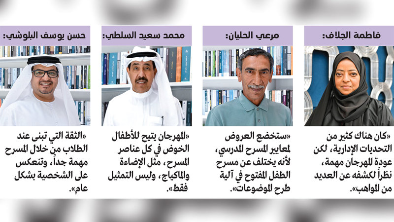 وأكد عضو لجنة التحكيم حسن يوسف البلوشي، أن المسرح المدرسي يتطلب معاملة خاصة مع الطلاب، وبأنه يجب أن يطرح القضايا التي تعكس واقع أعمارهم، وليس عرض ما لا يتناسب مع الفئات العمرية. ورأى أن هناك حاجة للكوادر التي تمتلك الحضور، لأن الهم الأساسي للجنة التحكيم اكتشاف المواهب وصقلها. واعتبر أن الثقة التي تبنى عند الطلاب من خلال المسرح مهمة جداً، وتنعكس على الشخصية بشكل عام، وليس على مستقبلهم المسرحي فقط.