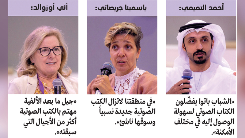 وشارك في الجلسة أحمد التميمي، أحد أهم المعلقين الصوتيين في «سناك بوك» الذي سجل أكثر من 45 كتاباً صوتياً، وياسمينا جريصاتي، مديرة التحرير في «ستوري تيل»، واحدة من أكبر شركات الاشتراك في خدمة الكتب الصوتية والإلكترونية، ونائبة رئيس قسم الكتب والصوتيات في شركة «فرانكلين كوفي» آني أوزوالد.