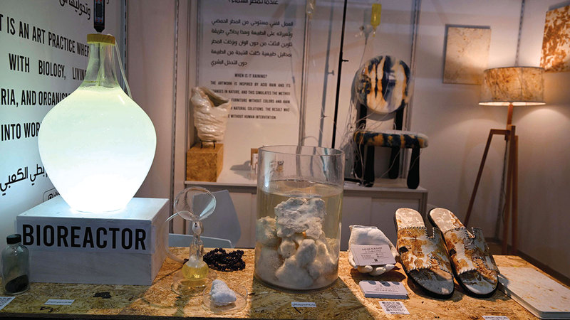 ويقدم الكعبي في جناحه مصنوعات تم تنفيذها باستخدام جلود نباتية مصنعة من جلد المشروم، بتصميمات فنية مختلفة منها مصباح طاولة «أباجورة» وقطع إضاءة، وأغلفة كتب، وبراويز للصور، ونعال، وتم تنفيذها بالتعاون مع الفنان الهولندي أندي كارتير، وهو من الفنانين المهتمين بالاستدامة على الصعيد العالمي، والاستوديو الخاص به. لافتاً أن هذا النوع من الجلود يتم تصنيعه في هولندا لدى مختبر حاصل على براءة اختراع له، وتم إحضاره وزراعته في المختبر ثم تطويره ليصبح صديقاً للبيئة، وتشكيله بالتعاون مع كارتير في التصميمات الفنية المعروضة. مشيراً أن الجلود النباتية عبارة عن ألياف، وهي بدائل طبيعية ومستدامة وآمنة أكثر من الجلود الحيوانية أو الصناعية، نظراً لأن استخدام جلود الحيوانات وعملية معالجتها لها أضرار كبيرة على البيئة، كما تضر الحيوانات في البيئة.