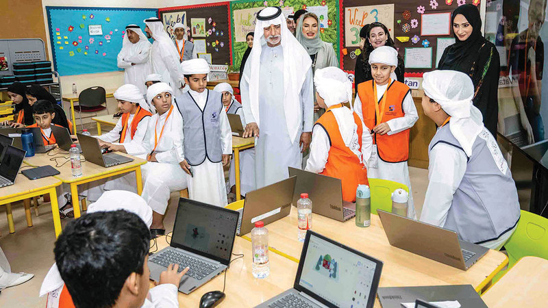 نهيان بن مبارك يتابع العروض التي قدمها طلاب البرامج الصيفية التي يقيمها صندوق الوطن. من المصدر