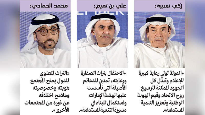 وأشار المستشار الثقافي لصاحب السمو رئيس الدولة، الرئيس الأعلى لجامعة الإمارات، زكي نسيبة، إلى أن الدولة تولي رعاية كبيرة للإعلام وتبذل كل الجهود الممكنة لترسيخ روح الاتحاد وقيم الهوية الوطنية التي قام عليها، وتعزيز التنمية المستدامة للفرد والمجتمع والأسرة، والتطوير المهني للإعلام المحلي ورفده بالكوادر الإماراتية، فهذه القيم ركيزة أساسية من الركائز التي أسهمت في أن تتصدّر الإمارات دول العالم في أهم معايير الحياة بمختلف جوانبها، موضحاً أن الدولة عملت على إتاحة فرص التدريب للمواطنين والمواطنات من الخريجين الجامعيين، لتحقيق أهداف تأهيل الكوادر الحريصة على تراثها وثقافتها، ورفع مستوى الوعي بأهمية التراث، وإيجاد بنية تحتية قادرة من الموارد البشرية، للحفاظ على التراث الثقافي وإدارته، وتفعيل جهود المجتمع تجاه صونه واتباع أسس التنمية المستدامة.