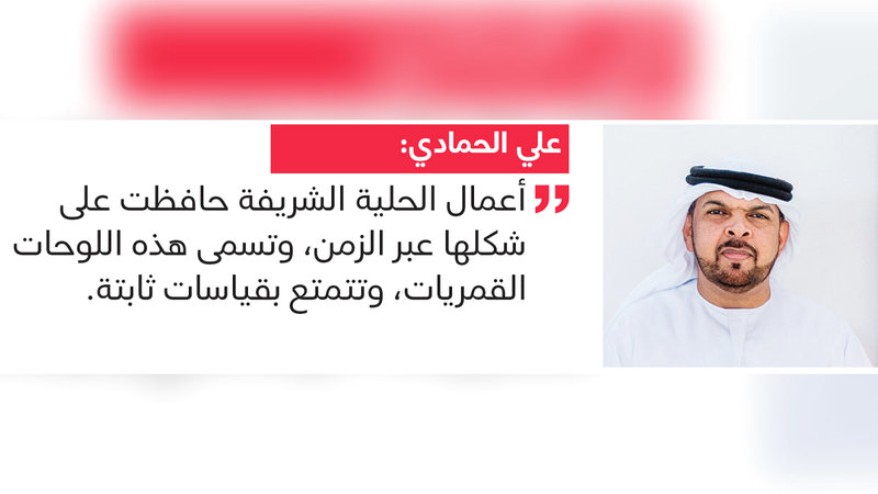 ووضع الحمادي اسم أستاذه فاروق الحداد في اللوحة، وبالقرب من توقيعه، في تعبير واضح عن الشكر والوفاء له ولفضله في تعليمه، مشيراً إلى أن أعمال الخطاطين القدماء كانت توضع فيها أسماء الأساتذة. وأضاف أن لوحات «الحلية الشريفة» تهدى للعروسين، مع نبتة أخرى كنوع من تمني الازدهار والخير في الحياة، منوهاً بأن هذه الأعمال حافظت على شكلها عبر الزمن، وتسمى هذه اللوحات القمريات، وتتمتع بقياسات ثابتة. أما الزخرفة الإسلامية التي تعد أساسية في هذه اللوحة، فأوضح الحمادي أنها لابد من أن تبدأ بلونين، هما الأزرق الداكن والذهبي. ووصف «بينالي دبي للخط» بأنه فرصة مهمة للفنانين والخطاطين من أجل الالتقاء وتبادل الآراء.
