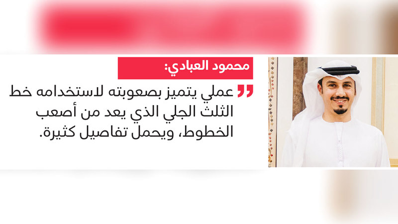 من جانبه، قال الخطاط محمود عبدالكريم العبادي، الذي يشارك بعمل بخط الثلث الجلي، إن رحلته مع عالم الخط بدأت منذ الطفولة، وما جذبه لهذا الفن هو والده الذي كان يخط الحروف، فضلاً عن دروس الخط المدرسية، ومن ثم معهد الخط العربي في الشارقة. وأشار إلى أنه أحاط الآية القرآنية التي خطها بالزخرفة، لأن الخط والزخرفة يتكاملان في العمل الفني، ولكن بما يتناسب مع مقتضيات اللوحة والنص.