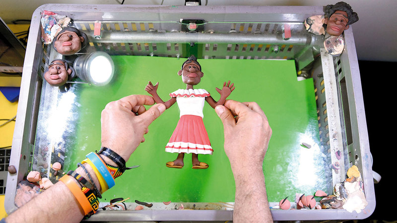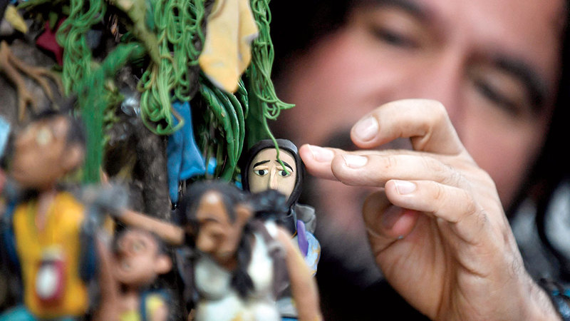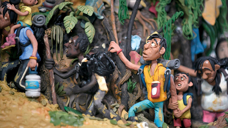 الفنان الكولومبي إدغار ألفاريز الشهير بـ« فنان البلاستيك، يعرض أحد تماثيله المصنوعة من البلاستيك خلال مقابلة في الاستوديو الخاص به في بوغوتا، يعكس ألفاريز في أعماله التي لفتت الانتباه إليه كفنان من طبيعة خاصة حكايا وقصص الهجرة، ويعيد رواية قصص معاناتها بأعماله الصغيرة التي يصنع منها مشهديات تعبيرية، ويركز الفنان على المهاجرين من كولومبيا في طريق يسمى «لوما دي لاس بانديراس»، وهي المنقطة الأكثر تحدياً لأولئك الذين يذهبون من كولومبيا إلى بنما عبر غابة دارين الخطرة متطلعين للوصول إلى الولايات المتحدة.