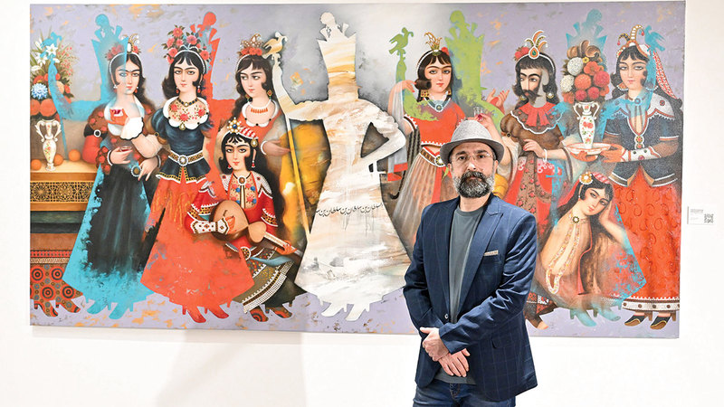 واختار بيات في معرضه أن يغوص بعيداً في التاريخ وتحديداً في فترة حكم القاجاريين، حيث مزج ملامح من فنون تلك الفترة مع لمسات عصرية ولغة معاصرة، بأسلوبه الخاص ليعبر عن مكانة المرأة، وسعيها إلى البحث عن هويتها وإثبات ذاتها في ظل عالم ذكوري يقيّدها بتقاليد وأفكار متوارثة، وفق ما أوضح لـ«الإمارات اليوم»، لافتاً إلى أن عنوان المعرض «قجر بازي» هو مصطلح يشير إلى أسلوب الفكاهة والمرح في الأعمال الفنية التي تم تقديمها في فترة القاجار، كما أنها تشير إلى التوظيف الإبداعي للعناصر والمكونات الفنية المتميزة في ذلك العصر (القرنان الثامن عشر والتاسع عشر).