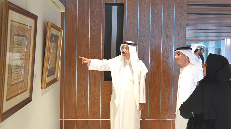 محمد المر يُطلع علي بن تميم على أعمال «خطوط وأشعار». من المصدر