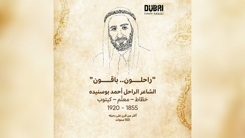 تحتفي هيئة الثقافة والفنون في دبي «دبي للثقافة» بالإرث الإبداعي للشاعر الإماراتي الراحل أحمد بن عبدالرحمن النعيمي المعروف بـ«أحمد بوسنيده»، من خلال برنامج «راحلون باقون» الذي ينظم في 20 الجاري بمتحف الاتحاد، ويسلط الضوء على مساهمات الشاعر الراحل التي أثرت المشهد الثقافي المحلي.