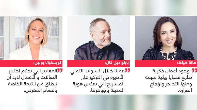وحول الفن المستدام الذي شكّل حضوراً واسعاً في النسخة الماضية، نوهت خياط بأنه بالطبع سيكون حاضراً في هذه النسخة، خصوصاً أن إفريقيا ستحضر بقوة في المعرض، وهذه الدول دائماً ما يعمل الفنانون فيها بمواد ترتبط بالأشياء التي يعيدون توظيفها، وهذا يدخل في مجال الاستدامة، مشيرة إلى وجود أعمال فكرية تطرح قضايا بيئية مهمة ومنها التصحر وارتفاع الحرارة. واعتبرت خياط أن الفنان هو مرآة الحياة الحقيقية، وبالتالي فإن الفنانين المعاصرين لابد أن تحمل أعمالهم هذه الاهتمامات، فالمعرض يعتبر مرآة لما يحدث في العالم.