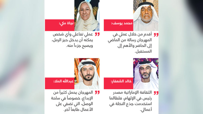 وتباينت المواد التي صممت منها أعمال المهرجان، الذي انطلق في 26 الجاري ويتواصل لـ10 أيام، ولكنها بمجملها شكلت إطلالة على الثقافة الإماراتية، وما تحمله من تنوّع وتميز.