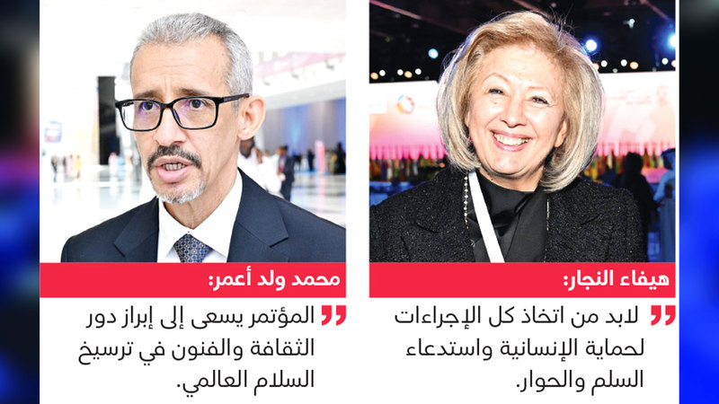 وأعرب عن أمله في أن يشهد المؤتمر الاتفاق على الإطار المرجعي المنتظر بما يسهم في استشراف المستقبل وحلول السلام والسلم في العالم أجمع. وأضاف ولد أعمر لـ«الإمارات اليوم»: «تعزيز دور الثقافة والفنون يتطلب ترسيخ السلام الذي نتمنى أن يعم العالم».
