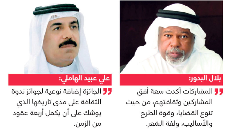 وقال رئيس مجلس إدارة ندوة الثقافة والعلوم رئيس مجلس أمناء الجائزة، بلال البدور، إن المشاركات التي تقدم بها الشعراء أكدت سعة أفق المشاركين وثقافتهم، من حيث تنوع القضايا المطروحة وقوة الطرح والأساليب ولغة الشعر، وتقدم بالشكر للجان التحكيم التي قرأت جميع القصائد، وتناولتها بالحيادية والشفافية والتجرد، واحتكمت إلى الإبداع والفن الشعري، دون معرفة أسماء الشعراء ومواطنهم.
