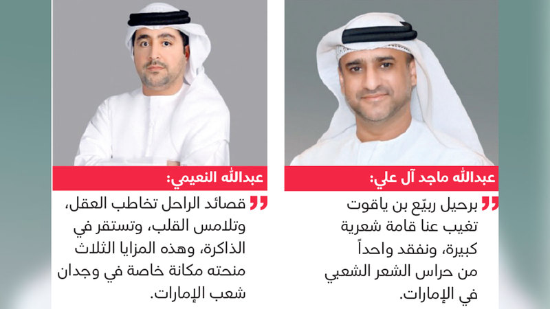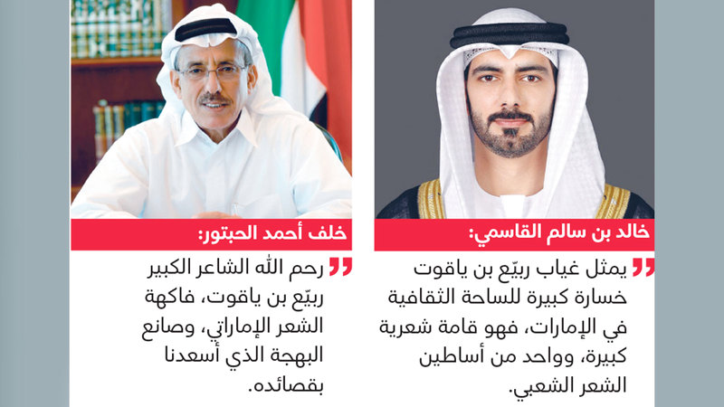 ونعى الشيخ خالد بن سالم القاسمي، وزير الثقافة، الشاعر الكبير في تغريدة نشرها على حسابه في منصة «إكس»، قال فيها: «يمثل غياب ربيّع بن ياقوت خسارة كبيرة للساحة الثقافية في الإمارات، فهو قامة شعرية كبيرة وواحد من أساطين الشعر الشعبي. عرفناه شاعراً رقيق اللفظ، وشّحت الدعابة شعره الاجتماعي، وأمتعنا بأجمل قصائد الغزل من دون ابتذال. رحم الله فقيدنا الكبير، وألهم ذويه ومحبيه الصبر والسلوان».