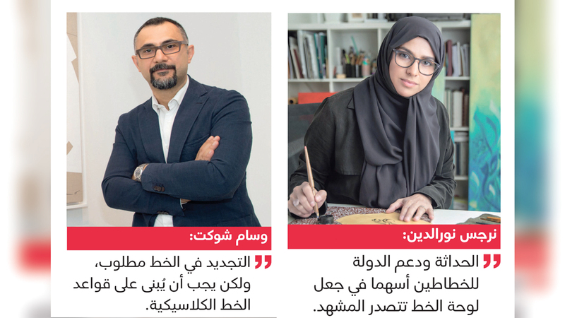 من جهته، لفت الخطاط العراقي وسام شوكت، إلى أنه يقيم في الإمارات منذ 23 عاماً، ورحلته مع الخط في الدولة عمرها 24 عاماً بعد أن شارك بمعرض في الشارقة كان السبب في قدومه للإمارات، موضحاً أن الإمارات شهدت حركة خطية، بدأت بصدور مجلة تُعنى بالخط، والمعارض الدولية في الشارقة، ومن ثم أسهمت دبي بتطور الخط «من خلال الدعم الذي قدم من خلال شخصيات لها وزنها مُحبة لفن الخط العربي، أمثال محمد المر وعبدالرحمن العويس وأنور قرقاش، الذين أثروا في تطور حركة الخط من خلال استقطاب بعض الخطاطين والمعارض النوعية، وكذلك دعمهم المباشر في اقتناء الأعمال». وأشار إلى أن المبادرات المحلية طورت في فن الخط وأثرت في العديد من خارج الدولة أيضاً، فقد انعكس هذا التطور على التجربة التركية في الاهتمام بالخط العربي، والتي شهدت تطوراً كبيراً، فضلاً عن تأثر دول الجوار، ومنها عُمان والسعودية والكويت وقطر.