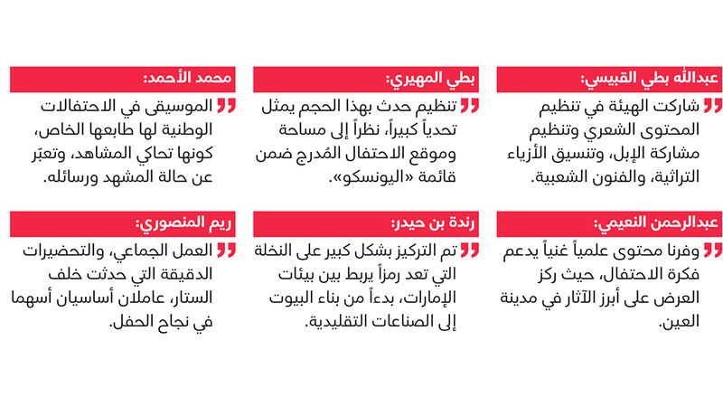وأكدت ريم محمد المنصوري، من شركة بني وآل للثقافة، أن العمل الجماعي، والتحضيرات الدقيقة التي حدثت خلف الستار، عاملان أساسيان أسهما في نجاح الحفل لهذا العام، وما يميز التجربة هو حماسة الجميع، خصوصاً أن الحفل الرسمي يُقام في مدينة العين، حيث كان الجو مملوءاً بالمشاعر الإيجابية.
