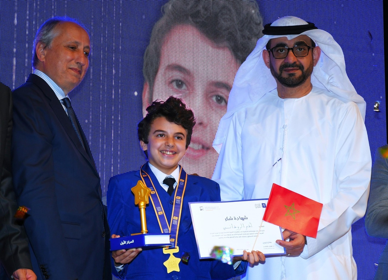 وجرى تتويج الطالب آدم الروداني من الصف الثامن في مدرسة الإمام الشافعي التابعة لمنطقة الرباط سلا القنيطرة خلال الحفل الختامي الذي جرى في العاصمة المغربية الرباط، بحضور معالي محمد سعد برادة وزير التربية الوطنية والتعليم الأولي والرياضة في المملكة المغربية، ومشاركة الدكتور فوزان الخالدي، مدير إدارة البرامج والمبادرات في مؤسسة "مبادرات محمد بن راشد آل مكتوم العالمية"، ومسؤولين وتربويين ومعنيين بالشأن الثقافي وعدد كبير من ذوي الطلبة المشاركين في المنافسات.