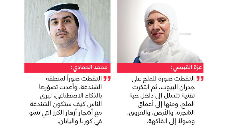 شاركت الفنانة الإماراتية عزة القبيسي في المعرض من خلال عملها «بين الشندغة»، وهو العمل الأول الذي تقدمه بتقنيات الذكاء الاصطناعي، إذ قدمت فيلماً قصيراً من خلال الصور التي التقطتها في الشندغة. وأعادت القبيسي تخيل الانتقالات بين الظل والشجرة، وتحدثت لـ«الإمارات اليوم» عن عملها، قائلة: «كانت تجربة العمل بالذكاء الاصطناعي رائعة، ومنحتني الثقة لتجريب ما أحب، فقد شاركت بدورة تدريبية مع الفنان أحمد العطار، سلّط الضوء من خلالها على فكرة تصوير الشندغة بمساحة محددة، ما جعلنا نرى الشندغة بعيون مختلفة، بعيداً عن المألوف». وأضافت: «التقطت الكثير من الصور للشندغة، واخترت من بينها سبع صور، ربطت بينها من خلال تقنية (الانيميشين)، وكانت تجربة تحمل الكثير من التحديات، ولكنها منحتني الكثير من الأفق في العمل الفني، ولم أتصور أنني سأتمكن من تقديم هذا العمل من خلال دورة بسيطة». ولفتت القبيسي إلى أنها التقطت صورة للملح على جدران البيوت، ثم ابتكرت تقنية وكأنها تدخل حبة الملح، ومن خلالها، إلى أعماق الشجرة، والأرض، والعروق، وصولاً إلى الفاكهة. ونوهت بأنها أرادت إبراز الجزء الخفي وغير الملموس من الثقافة، لاسيما الحياة التي عاشها الناس من قبل. ولفتت القبيسي إلى أن الذكاء الاصطناعي يعمل وفق رؤية الفنان، معتبرة أنها من خلال عملها على أعمال معاصرة، تمكنت من الحصول على إحساس بصري لا يمكن رؤيته إلا في الخيال من خلال الذكاء الاصطناعي، وهذا يجعل الناس ترى أسلوب تفكيرها.