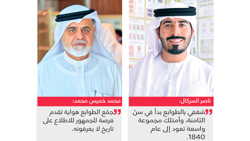 أما جامع الطوابع وعضو مجلس إدارة جمعية الإمارات لهواة الطوابع، ناصر بن أحمد بن عيسى السركال، فبدأ شغفه وهو في الثامنة من عمره، مشيراً إلى أنه يمتلك مجموعة واسعة تعود إلى عام 1840، حيث تضم أول طابع صدر في العالم ببريطانيا، كما أنه يمتلك مجموعة دبي التي تعود إلى الفترة من عام 1909 إلى 1973، والتي عرضها في مكتبة محمد بن راشد، وتُصنّف مجموعة طوابع دبي بكونها تقليدية.