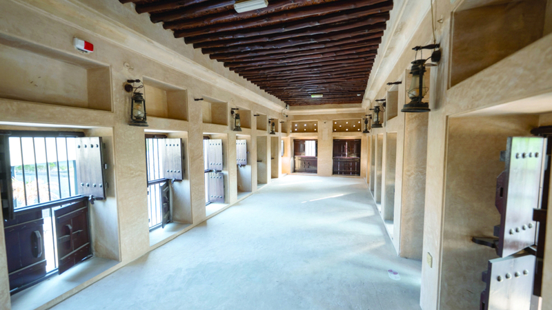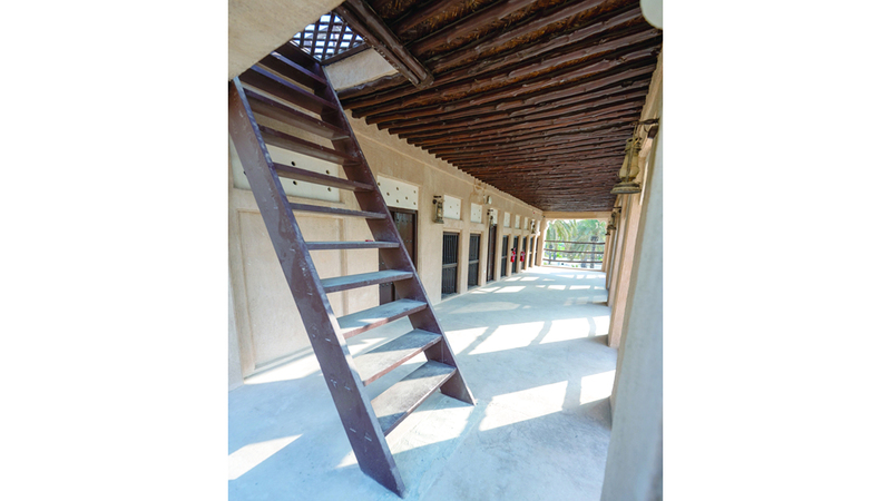 السلالم الخشبية الضيقة تصعد بك نحو الطابق العلوي، حيث تبدأ رحلة أخرى، هنا المجلس الرئيس.. الفضاء الأوسع والأكثر هيبة، الذي شهد جلسات المغفور له الشيخ راشد بن سعيد آل مكتوم، طيب الله ثراه، ومناقشات مستشاريه، الأرض مفروشة بسجاد يدوي، والوسائد المطرّزة مصطفّة على طول الجدران، في مشهد يجمع بين البساطة والوقار، وعلى الجدران عُلّقت بنادق تقليدية وسيوف عربية قديمة، كأنها شواهد على روح الحماية والكرامة التي سادت ذلك الزمان.