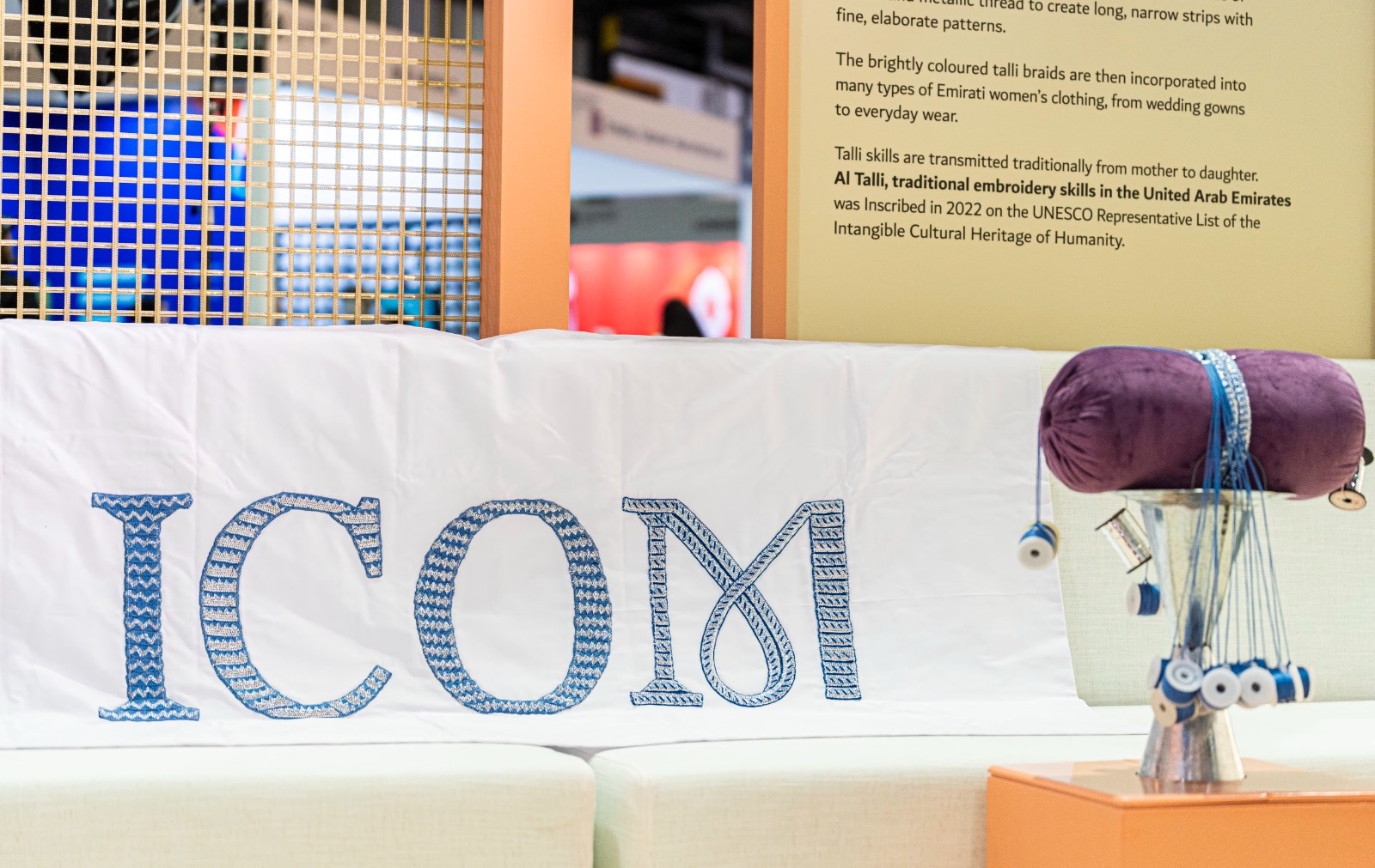 ويُبرز التصميم شعار "آيكوم" بدرجتين من اللون الأزرق، منسوجتين باستخدام أربع غرز تلي تقليدية هي: «فنخ البطيخ»، و«بروي/المشارة»، و«الفن»، و«الكولي». وتمثل كل غرزة إرثاً فنياً يعكس مهارة الحرفيات ويجسد تنوع النسيج الثقافي الإماراتي، فيما تتكامل هذه الغرز معاً لتجسيد شعار المؤتمر «مستقبل المتاحف في مجتمعات سريعة التغيير». ومن خلال تداخل هذه النقوش وانسجامها، تتشكل لوحة فنية تعبّر عن وحدة التنوع عبر مزج الأصالة مع الابتكار، وتُبرز مكانة الثقافة جسراً للتواصل بين الشعوب، ومنصةً لاستشراف المستقبل، وتحتفي بالإبداع المتجذّر في التراث الإماراتي.