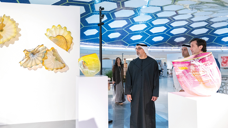 وقام سموّه بجولة في المعرض، اطّلع خلالها على التجارب الفنية التي يستعرضها «نوماد أبوظبي»، وما يتضمّنه من أعمال وتصاميم فريدة تعكس العلاقة بين الفن والعمارة.