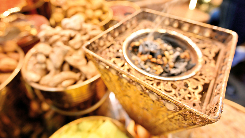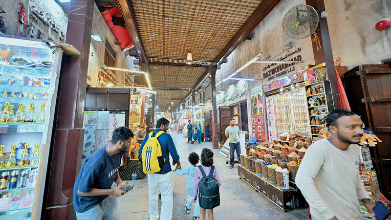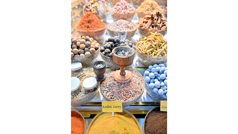 وعند أولى خطوات الزائر، يشعر كأنه عاد بالزمن إلى القرن الـ19؛ رائحة التوابل تتخلل الهواء، حيث تعرض محال «الدويّات» أكثر من 80 نوعاً من الأعشاب والبهارات، ممتزجة بعطور العود والبخور، لتخلق تجربة حسية تأخذ المرء في رحلة عبر التاريخ، حيث كان السوق نقطة محورية لتجارة التوابل والأقمشة والمجوهرات، وبينما تتلون الأزقة الضيقة بنقوش الأقمشة التقليدية، والمخاوير، والثياب العربية، تمتد محال الأدوات المنزلية والمطبخية والنحاسية، لتعكس الحياة اليومية القديمة في دبي.