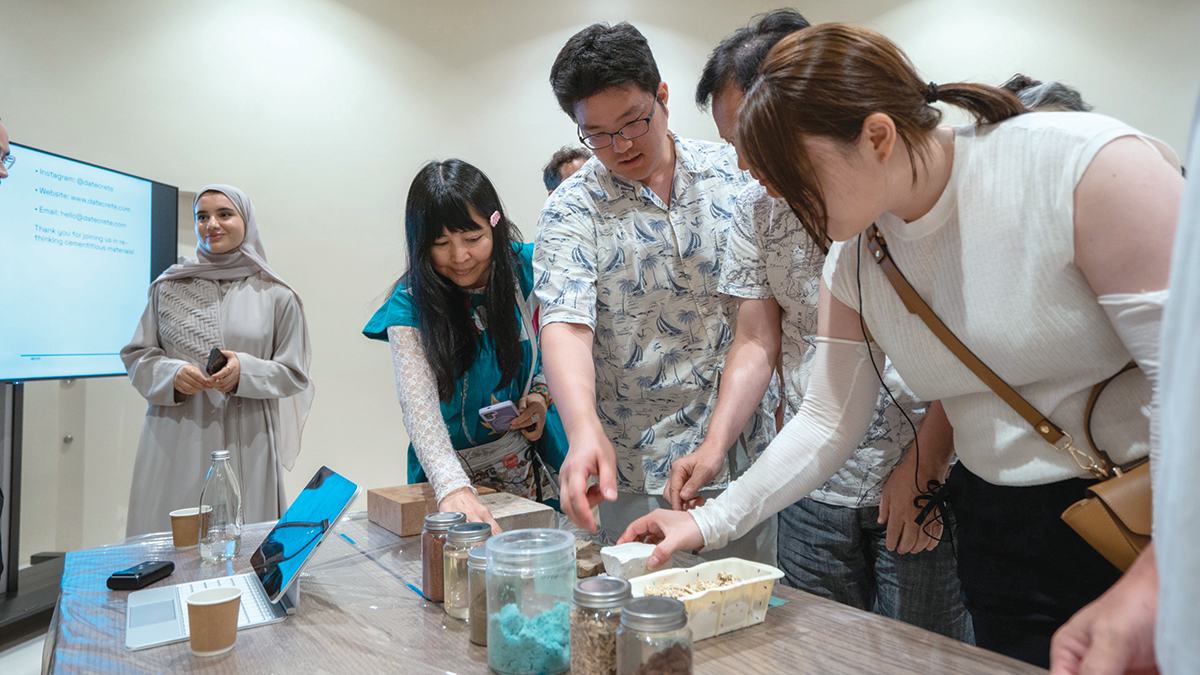 ولم تقتصر المشاركات بجناح الإمارات في إكسبو 2025 أوساكا على الثقافة والفنون البصرية، فانصبت مشاركة سارا أبوفرحة وخالد شلحة، على مجال البناء المستدام، وهو مجال تخصصهما، عبر تصميم ورشة العمل لتكون بمثابة مدخل عملي وثقافي إلى بدائل الإسمنت والخرسانة التقليدية، والتعريف بمادة «ديتكريت»، البديل الخالي من الإسمنت والراتنج، المصنوع من نوى التمر المطحون، وهي قيد الحصول على براءة اختراع، كما شملت الورشة نقاشات حول التراث العالمي للمواد الإسمنتية، من ملاط الشرق الأوسط إلى جص الشيكوي الجيري الياباني.