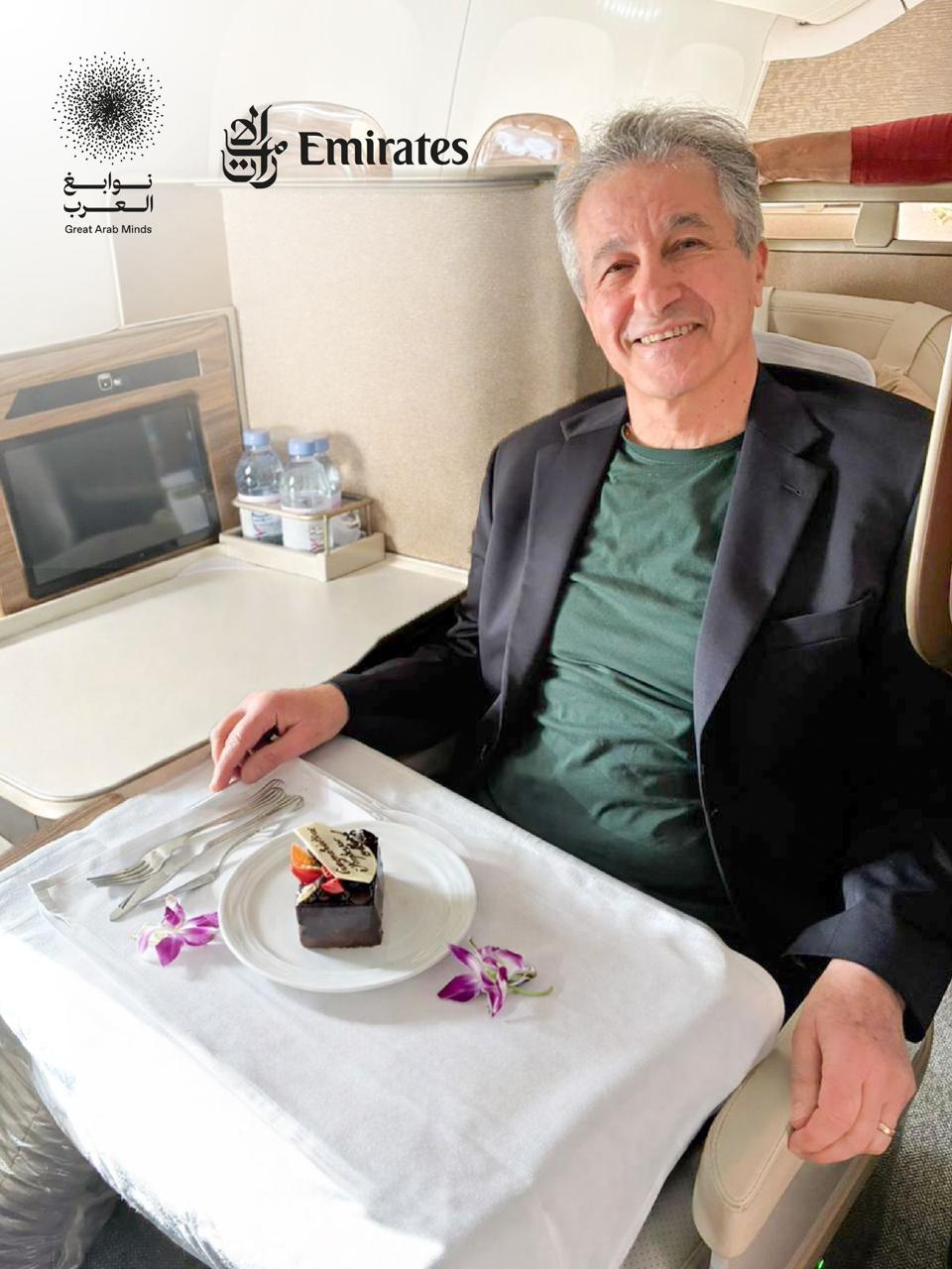 وقدّم طواقم طيران الإمارات في الجو خلال الرحلة قالباً من الحلوى مزيّناً باسم الفائز احتفاءً بتواجده على متنها، كما التقطوا الصور التذكارية معهم وشاركوها في النشرات الدورية ومنشورات صفحات التواصل الاجتماعي لطيران الإمارات في مختلف أنحاء العالم.