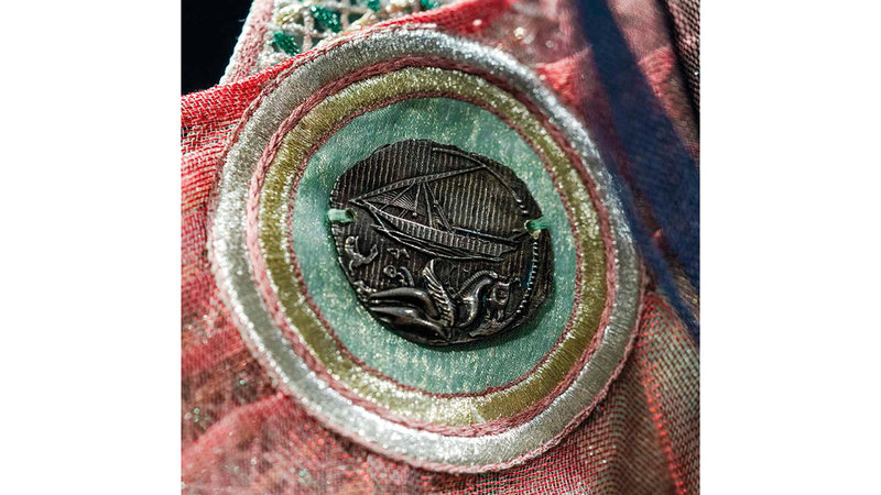 ويتميز تصميم الثوب بطبقة من التول الشفاف بلون برونزي تنساب بسلاسة من الكتف الأيسر، مستوحاة من أزياء مدينة تدمر القديمة، وقد تم تثبيتها بعملة «مشماش» معاد تدويرها لتجمع بين الطابع الفينيقي والدرهم الإماراتي، في إشارة إلى التبادل الثقافي واستمرارية الحضارات عبر الزمان والمكان.