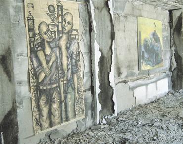 لوحات لفنانين فلسطينيين وعرب وأجانب تحولت إلى حطام بعد الحرب الإسرائيلية على غزة. تصوير: زهير دوله