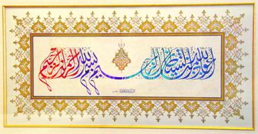 تعويذة وبسملة بالخط الديواني الجلي، أبدع الفنان في كتابتهما.
