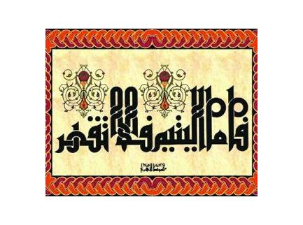 بالخط الكوفي الحديث أبدع الخطاط كتابة الآية الكريمة{فأمّا اليتيمَ فلا تقْهرْ}.