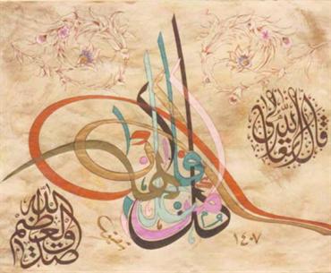 طغراء من خط الثلث للآية الكريمة {كل من عليها فان}، مع توشحة من الديواني، أبدع الخطاط بكتابتها.