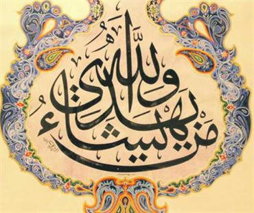 لـوحـة فنيـة رائـعـة، كـتبـها مبدعـها ووضعـها في إطـار ذي نقـوش إسـلامية، حمـلت الآيـة الكـريمـة: {والله يهدي من يشاء}.