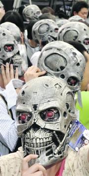 مجموعة من الجماهير المرتدية لأقنعة جماجم آلية، خلال الإطلاق الرسمي لفيلم «تيرميناتور سالفاشون» في طوكيو الأسبوع الماضي.