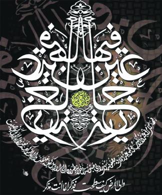 لوحة جميلة أبدع الخطاط في كتابة آيات من القرآن الكريم، يظهر فيها جمال الخط العربي وروعته.