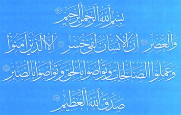 لوحة بخط المحقق، للخطاط ناصر الميمون، كتب فيها سورة العصر، مستخدماً زخارف جعلها فواصل بين الآيات، فكانت لوحة بديعة.