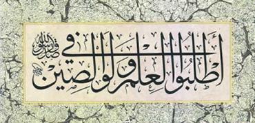 لوحة رائعة من مجموعة الخطاطة التركية نورية جارسي، كتبت فيها حديث رسول الله صلى الله عليه وسلم: «اطلبوا العلم ولو في الصين» بخط الثلث.