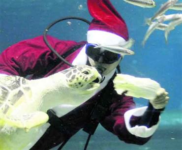 غوّاص يُطعم سلحفاة مائية وهو يرتدي ملابس بابا نويل في مستنبت كوكس المائي في سيؤول في كوريا الجنوبية، حيث يعد عيد الميلاد أطول عطلات البلاد .