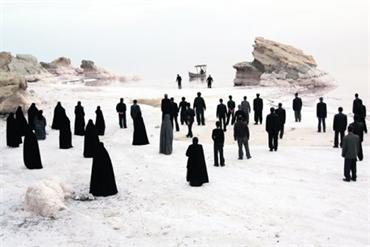 إننا أمام بحر أبيض، وجسد مغمور بالملح، السواد الذي تتشح به النساء يمضي كنقيض للبياض، بينما يمضي رحمة (حسن بورشيرازي) في قاربه وهو يجمع الدموع في قارورة، يمضي من مكان إلى آخر والدموع تتزايد وهو يصبها في قارورة أكبر تتمازج فيها دموع عشرات العيون الحزينة، ومصائر من زرفها معلقة بالبعيد، بأيام مغمورة بالملح، تعيش داخل كابوس طويل لا ينتهي، في نفق تنيره الشمس فيزداد عتمة، وكل ما في الفيلم ينطق بالكثير، يقودنا كما لو أننا نمشي في الشرايين، التي سرعان ما نكتشف أنها مقطوعة وثمة نزيف حاصل له أن يجرفنا، شرايين لا يدور فيها الدم بل الدمع.