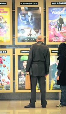 روّاد إحدى دور السينما في هونغ كونغ يقفون أمام ملصقات لفيلم «أفاتار»، إلا أن مشاهدي «أفاتار» من متحدّثي اللغة الإنجليزية وقفوا عاجزين أمام الدبلجة الصينية للفيلم بعد أن تمّ إقرار دبلجة الأفلام الأجنبية إلى اللغة الصينية فقط.